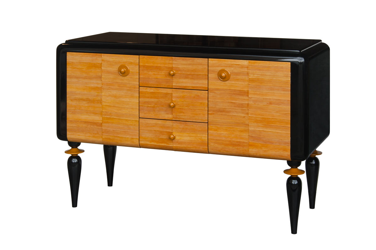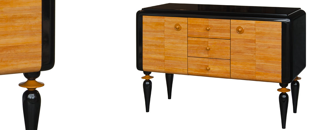 Comò in legno laccato nero con 3 cassetti e 2 ante rivestiti di pelle di galuchat o anguilla