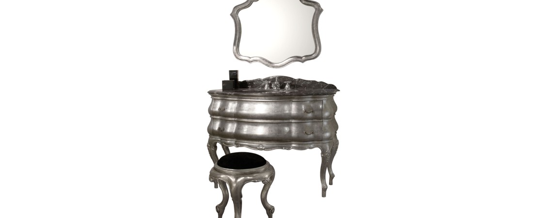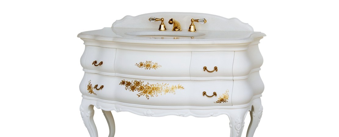Mobile da bagno 8585 in legno intagliato con 3 cassetti e piano in marmo o travertino
